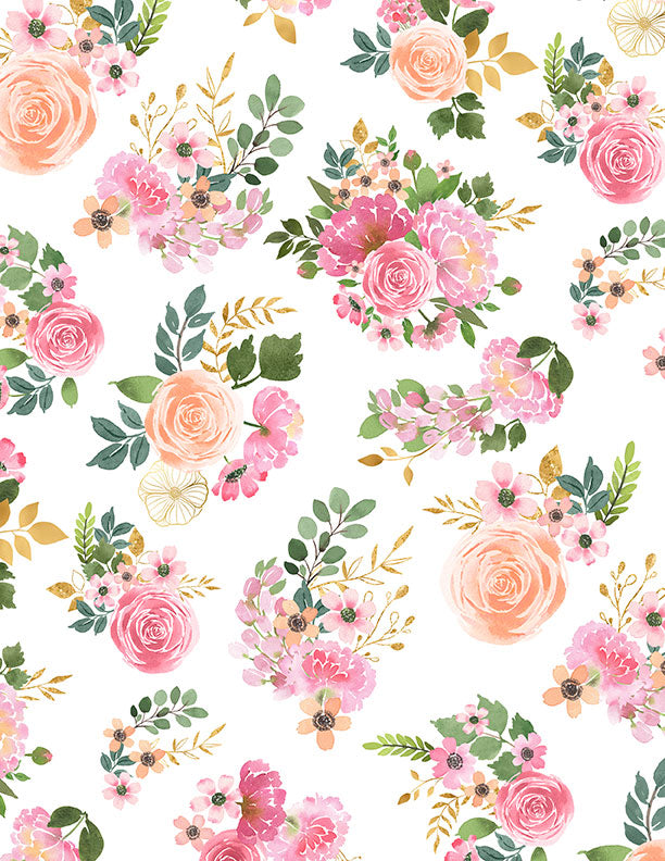 Wilmington Prints Peony Blossoms “Bouquet Toss” White Quilting Fabric – Floral Bouquets